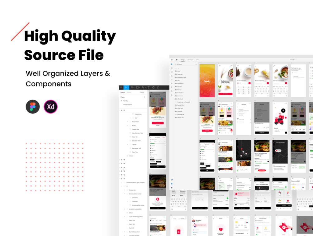 Foodly is a premium mobile UI Kit to help in your food delivery App Ui. It contains all 52 Screens you will need perfectly layered and organised. Each elements is carefully named and grouped so that you can edit, rearrange or straight use them for your app!